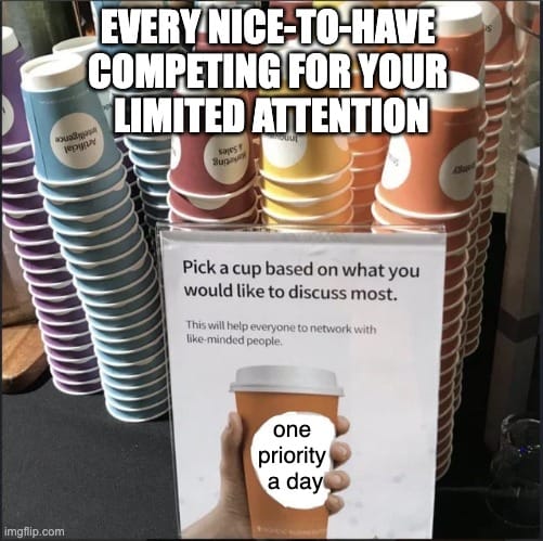 But the only thing we NEED to do each day is the one thing that keeps the lights on. One priority keeps us grounded and ensures momentum doesnāt stop. Itās better than zero, but more manageable than two. Sorted.